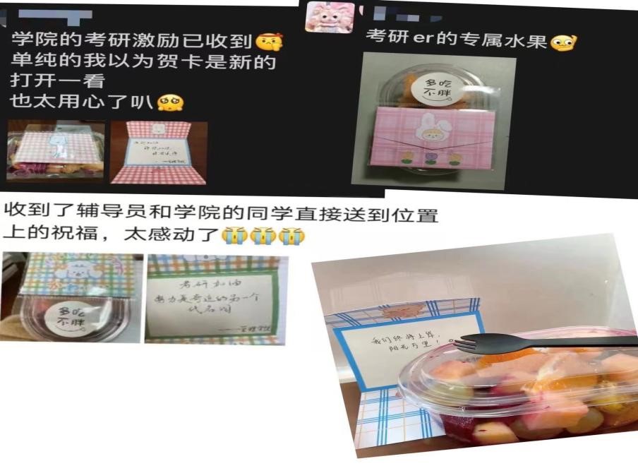 “我们终将上岸,阳光万里。”“考研加油,锦程灿烂。”一句句温馨祝福为考研学子们带来一丝暖意。今日的“暖心水果”,为考研作准备的学子们,暂时放下紧张的心情,投入到这温馨的场景中,考研同学纷纷表示对此次的到访感到十分惊喜,对于本次的水果他们也表达了深深的谢意。收到水果时,大家的脸上洋溢着笑容。