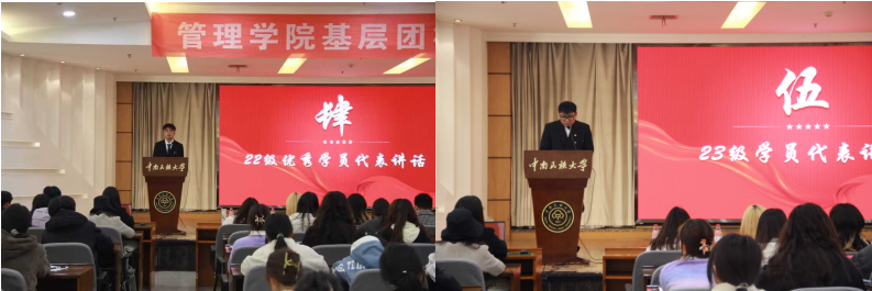 22级优秀学员田圆志同学结合自身经历,从寻找合适目标与合理安排时间两方面,针对学生工作与日常学习生活的平衡问题提供了经验与方案;23级学员代表李柯均同学向大家分享了自己从入团到开展学生工作的心路历程,并表示对日后的团校学习充满期待。他呼吁全体学员将个人理想融入民族复兴伟大梦想,以永不懈怠的精神状态奋勇向前。