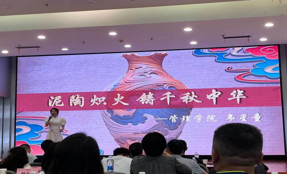 比赛过程中,韦星童以“泥陶炽火,铸千秋中华”为题,以饱满热情的姿态为在场听众讲述陶瓷与中华民族之间的深刻联系,将民族历史与陶瓷故事相结合,自信从容、声情并茂,将深厚的历史知识积累传递,展现了管院学子积极绚烂的青春风采,赢得了现场观众的阵阵掌声。