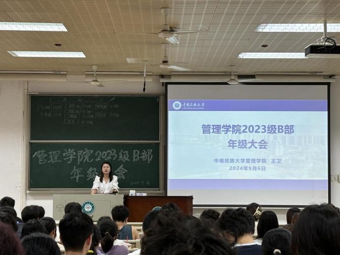 为帮助学生厘清学业规划路径和明确日常管理要求,9月6日下午,管理学院2023级B部于11栋100教室召开年级大会,近240名学生参会。会议由2023级辅导员王卫主持。