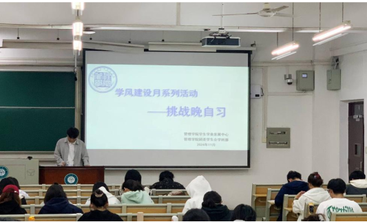 为营造学院良好学风,塑造学生学习习惯,提升学习效率,11月7日晚,管理学院团委学生会学科部于11栋314教室举办第一期“挑战晚自习”。本次活动现场由2022级辅导员姚亚南和学科部相关负责人监督组织,学院近百名学生通过自主报名参与。