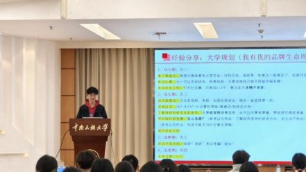 国奖风采展卓越,国励精神鼓人心。11月7日晚,管理学院2023-2024学年国奖国励分享会于润良报告厅顺利举行。学院勤工助学指导中心负责老师曾城皓、2022级辅导员姚亚南、2023级辅导员李丹出席本次大会,学院团委学生会主要负责同学及近200名2024级本科新生参加,会议由文工团主持人金靓琪、马鑫主持。