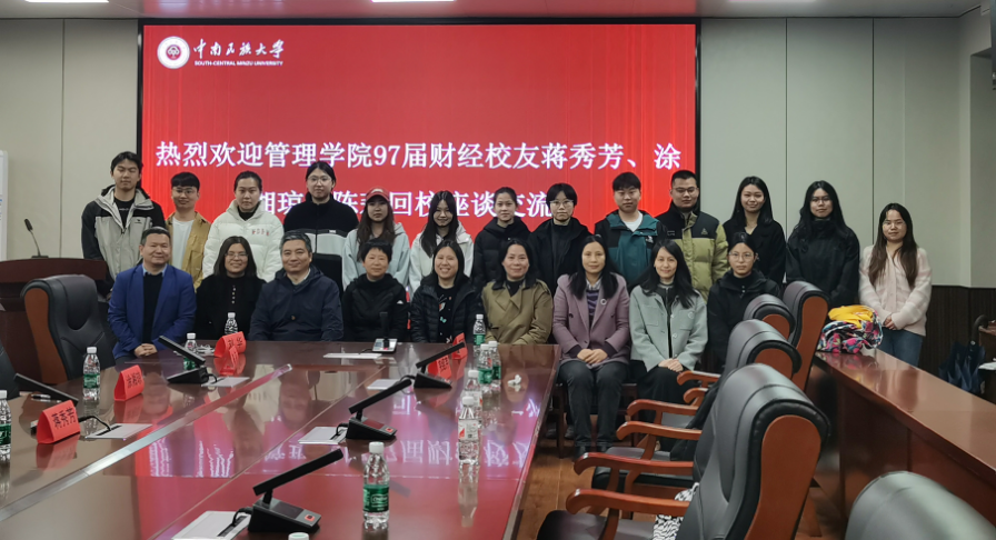 2025年3月28日上午,我院1993级财经系会计专业优秀校友蒋秀芳、涂湘琼、曾荣、刘放、张鸿、彭燕玲等重返校园,在5号教学楼206会议室内,师生共聚座谈。管理学院党委副书记李明亮、副院长周运兰,校友陈莉(数统学院组织员、我院财经93级),会计系主任刘华、财务管理系主任苏亚民,教师完绍芹,以及会计学硕专硕研究生、本科学生代表与北方民族大学交流生共同参与座谈。
