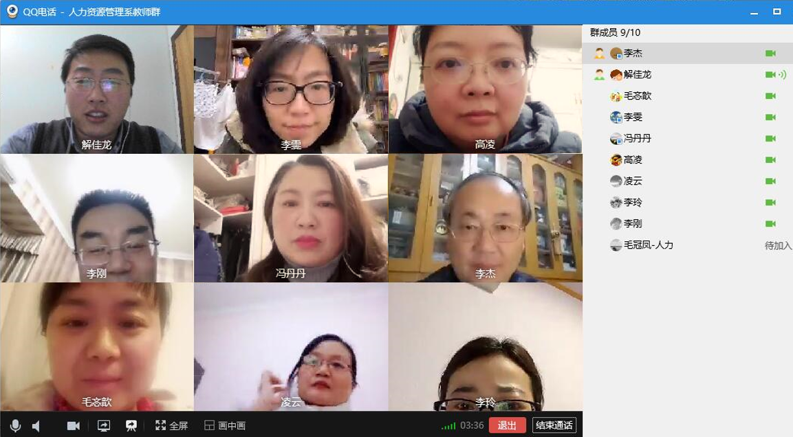 藏历新年前夕,习近平总书记给在北京大学首钢医院实习的西藏大学医学院17名临床医学专业本科生的回信,近期引发广大师生的热议。人力资源管理教研室于2020年3月2日20:00-20:45,组织开展了“习近平总书记给在首钢医院实习的西藏大学医学院学生重要回信精神”在线集体视频学习会议,教研室共10名专任教师,除1名在外访学教师外均参加了此次视频学习会议(如图1)。