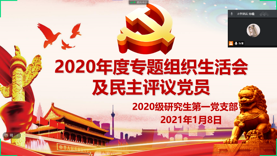 (文字作者:杨倩)2021年1月8日12:30,管理学院2020级研究生第一党支部通过腾讯会议平台,开展了2020年度专题组织生活线上会和民主评议会,支部党员全员参会,会议由支部书记陈瑾主持。