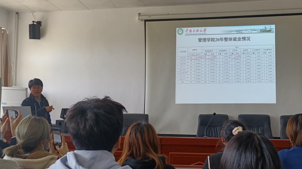 随后,杨单老师对比了历年来信管系学生考研、就业的数据,结合之前收集的18信管和大数据实验班考研就业的问卷调查数据,从数据的角度对考研就业的基本情况作了详细分析和说明,并向同学们提出了几点建议,准备就业同学要做到“四个需要”:需要明确就业方向、需要巩固课程理论知识、需要积极参与实习、需要务实专业技能;准备考研同学要做到“四个坚持”:坚持方向目标不动摇、坚持积极获取外界信息、坚持充分利用各方资源、坚持与师长交流和沟通。