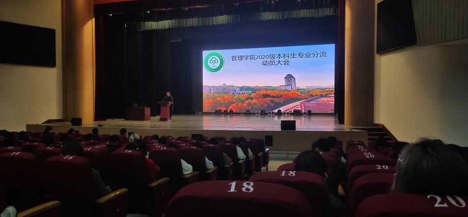 (文字记者:马翔 编辑:卢海涛)4月11日下午,管理学院在学校大礼堂召开了2020级本科生专业分流动员大会。管理学院党委副书记雷长生同志、副院长李超峰同志、会计学教研室主任刘华老师、财务管理教研室苏亚民老师、20级本科生辅导员卢海涛、罗兰以及2020级本科生参加本次会议。