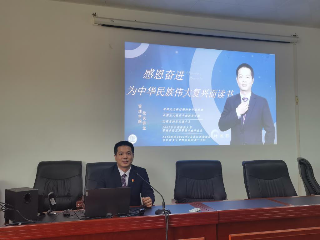 10月23日下午,管理学院邀请2003级工商管理专业校友叶映群为同学们做了一场“感恩前行、不负韶华”的主题讲座。叶映群回忆了自己的大学学习生活,讲述了毕业后的工作经历,认为生之艰难,来之不易,更应该感恩中国共产党,感恩父母,感恩学校和老师,建议同学们珍惜大学时光,不断提升自己,不忘初心,牢记使命,为中华民族伟大复兴而努力读书。管理学院2021级陆中茜同学认为:学长的讲座对我们是一次很好的党性教育、生命教育、校史校情教育,自己也要以学长为榜样,努力学习。叶映群校友工作于中国光大银行,2018年至2021年在江西省瑞金市叶坪乡下罗村任扶贫驻村第一书记,期间下罗村全体脱贫,叶坪乡被评为全国扶贫攻坚先进集体,叶映群被评为江西省扶贫先进个人,中国光大银行十佳扶贫干部。