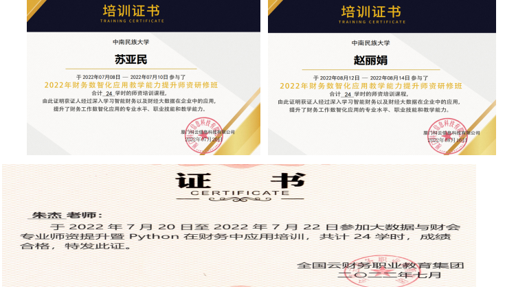 财务管理教研室为推动财务管理专业向数智财务转型、提升财务管理专业内涵、助力省级一流专业建设,谋划专业高质量发展,提升人才培养质量,于20227-8月开展了系统的数智财务师资培训。720-22日,组织3名教师参加全国云财务职业教育集团主办的“2022年大数据与财会专业师资提升暨Python在财务中应用培训”。78-10日及 812-14日,分两期组织3名教师参加厦门科云集团主办的“2022年全国高等院校财务数智化应用教学能力提升在线师资研修班”。