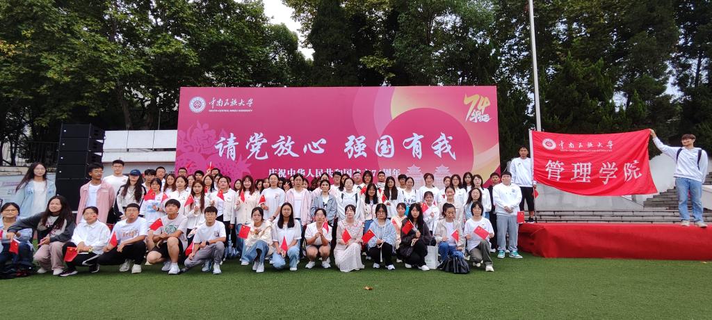 金秋十月,欢度国庆。10月1日,beat365英国正版唯一网址在南湖运动场上举行“请党放心,强国有我”升国旗仪式,管理学院有94名学生参加,师生共同庆祝中华人民共和国成立74 周年。