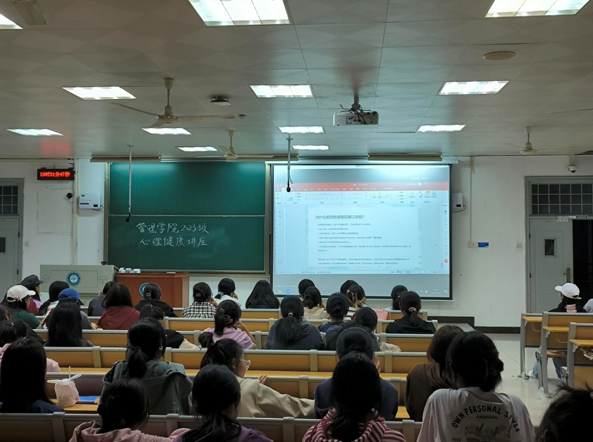 为迎接世界精神卫生日,进一步提升学院心理育人质量,普及精神卫生知识,促进学生心理健康素质、思想道德素质、科学文化素质协调发展,2023年10月6日晚,管理学院在15号教学楼教室举行2023级新生心理健康专题讲座,讲座邀请重庆五一职业学院吴佳妮老师主讲,管理学院心理健康工作站副站长、2023级辅导员李丹老师主持。讲座以“线上+线下”形式进行,有近300名学生在多个教室通过腾讯会议投影形式参与了本次讲座。
