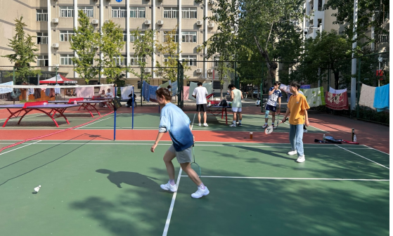规则介绍完毕,同学们纷纷热情洋溢地投入到比赛进程。赛事最激烈、参与人数最广泛的当属羽毛球混合双人比赛。九组选手通过抓阄的方式分为三队,每队内部两两对决后,角出优胜队伍,三支优胜队再次进行两两PK,最终分出了羽毛球项目的前三名。羽毛球混合双人比赛过程精彩异常,选手们都全力以赴,带来了高水平的竞技呈现。