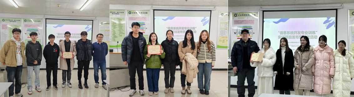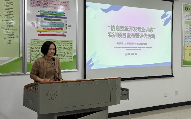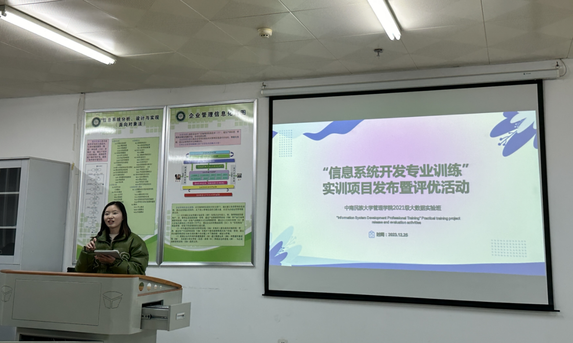 2023年12月25日下午,管理学院信息管理与信息系统专业于16栋教学楼103实验室成功举行了2021级大数据实验班实训成果汇报会,本次汇报会主题为2021级信管专业大数据实验班“信息系统开发专业综合实训”的项目发布、成果汇报、评优暨结业典礼。汇报会由陈谦、侯鹏辉同学担任主持人,全体2021级大数据实验班同学参加,参会的领导和老师有管理学院杨单、杨健、杜文华、马林茂老师以及实训合作企业武汉凡诺芯科技有限公司指导教师欧阳旻、黄民智、雷锦辉老师等。