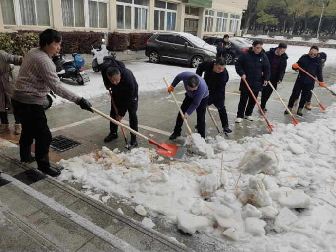调配铲雪铁锹,配备防滑手套,脱掉外衣,撸起袖子,一切准备工作就绪后,老师们先用铁锹铲出一条小道,再沿着小道从正面、侧面逐点突破,先钻再铲、先推再搬、先铲后扫,老师们研究出多种方式除冰铲雪。经过2小时的浴“雪”奋战,终于打通了进学院的“最后一米”。