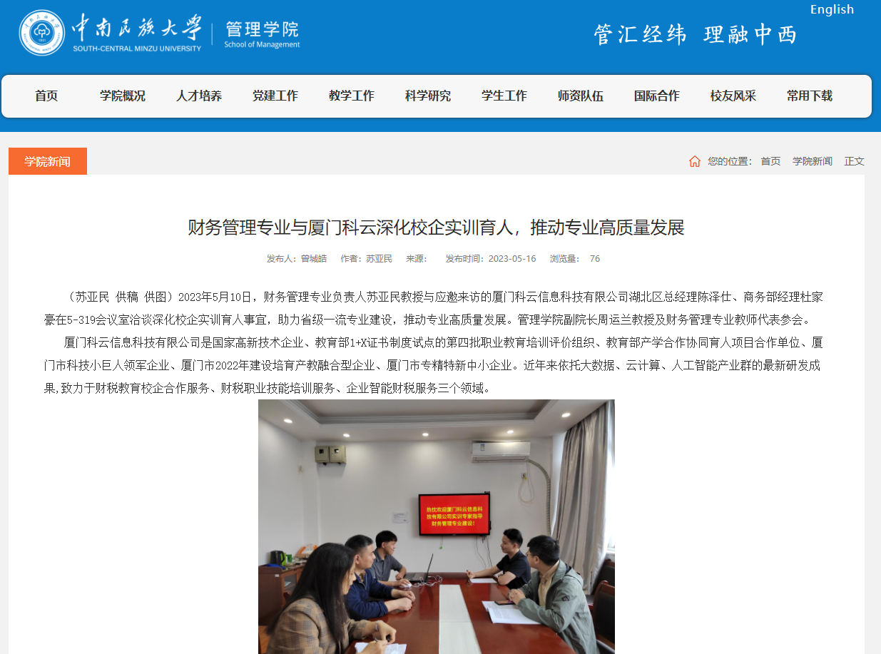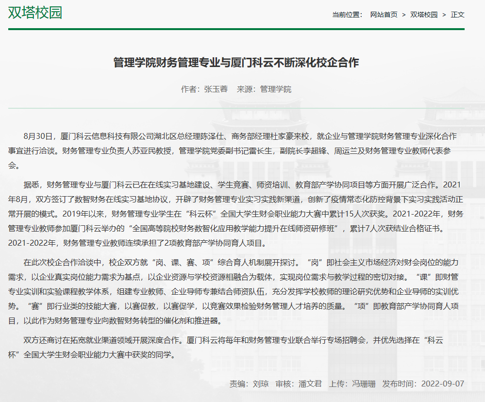 1. 财务管理专业与厦门科云在在线实习基地建设、学生竞赛、师资培训、教育部产学协同育人项目等方面开展广泛合作。(校园网-双塔校园-新闻,2022.9.7)管理学院财务管理专业与厦门科云不断深化校企合作-beat365英国正版唯一网址新闻网