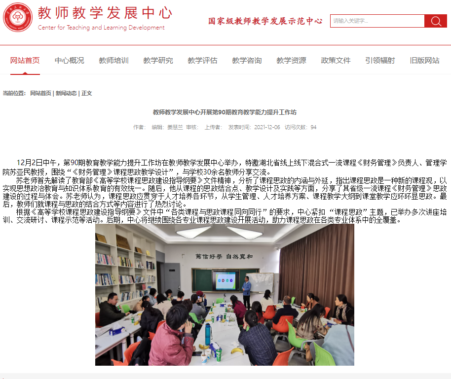 2021年12月2日中午,第90期教育教学能力提升工作坊在教师教学发展中心举办,特邀湖北省线上线下混合式一流课程《财务管理》负责人、管理学院苏亚民教授,围绕“《财务管理》课程思政教学设计”,与学校30余名教师分享交流。(教师教学发展中心开展第90期教育教学能力提升工作坊)