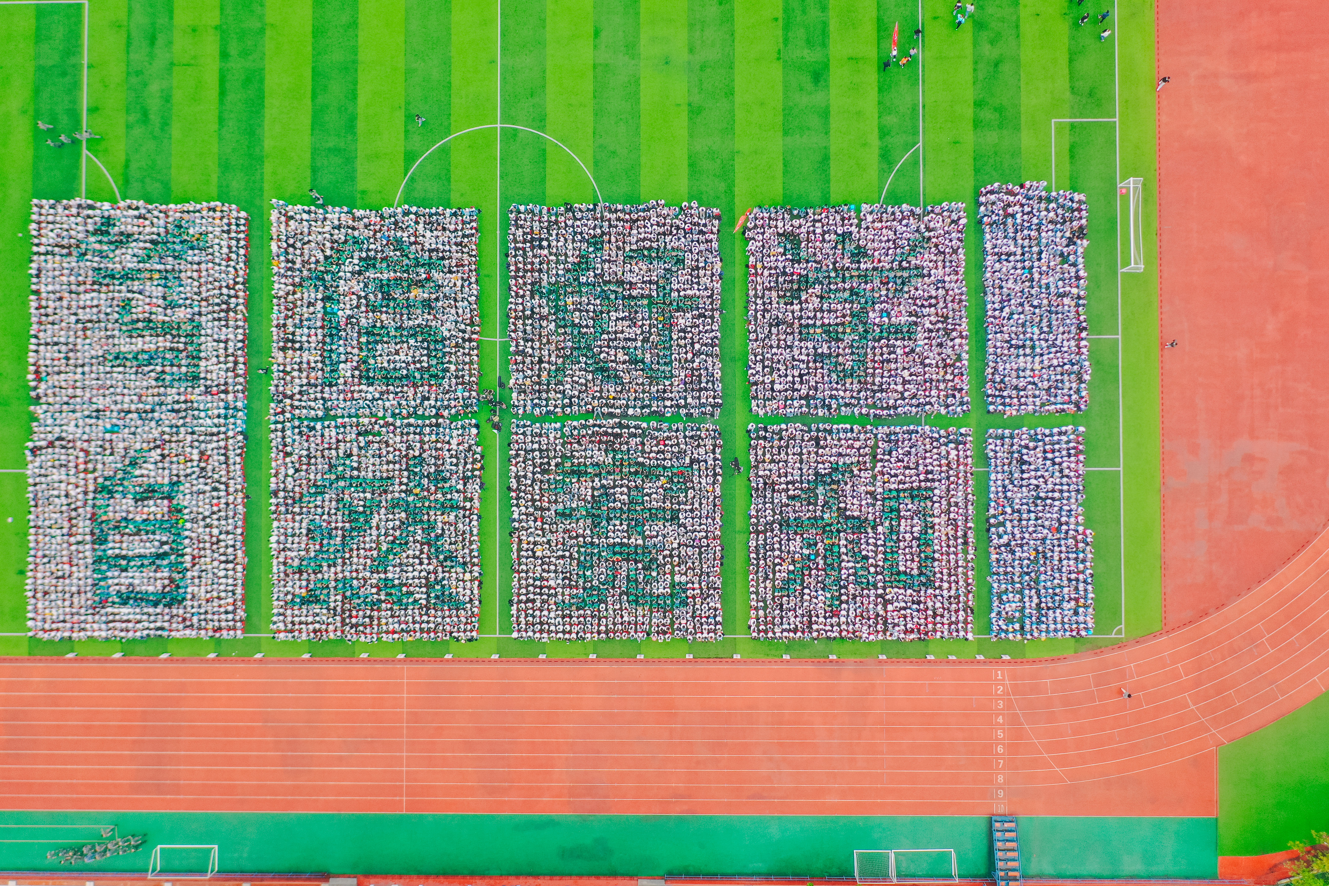 (新生们身着不同颜色的校服,拼成校训“笃信好学,自然宽和”)