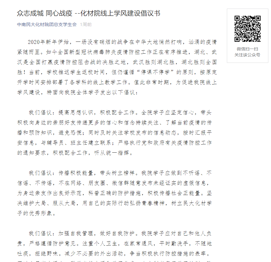 化学与材料科学学院在线学风倡议书部分内容。 结合专业学习要求,音乐舞蹈学院打破学院一贯“手机不进课堂”的做法,以“舞”抗“疫”。学生们在家录制练功、练声的视频,通过打卡、直播等形式,彼此监督,保证疫情防控期间学习进度和学习质量。 美术学院“以赛促学”,组织开展了“武汉·吾捍:艺术的力量”征稿活动,广泛征集抗击疫情主题创作作品。同时,结合课程教学安排,引导学生努力创作更多振奋精神、鼓舞士气的优秀作品,弘扬主旋律,传播正能量,助力早日打赢疫情防控阻击战。
