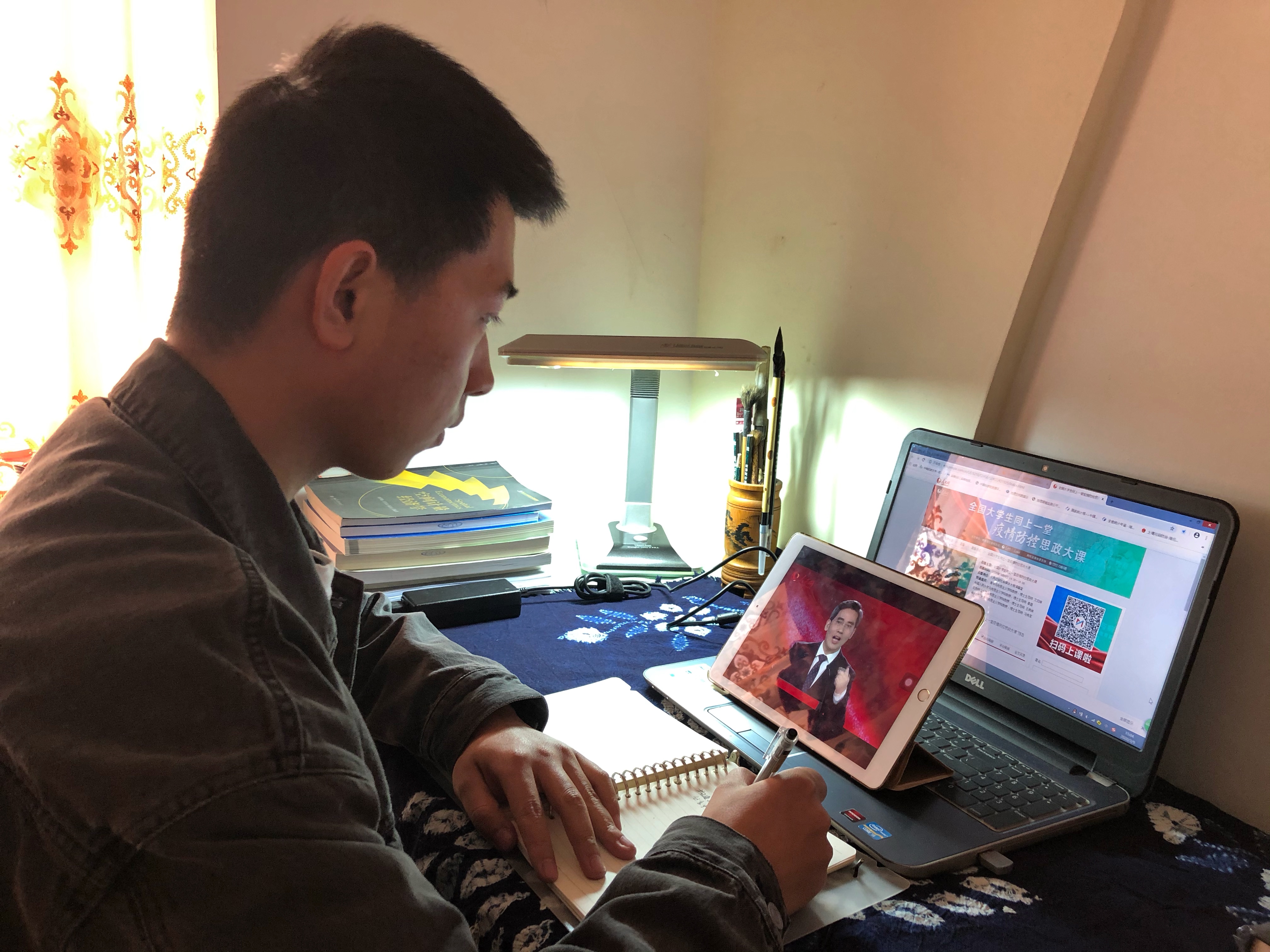 师生在线听课。 在湖北鄂州的向红(电子信息工程学院专职辅导员): 新冠肺炎疫情来袭,我们经历着史上最长的寒假。所有人都希望这个“长假”早些结束,希望2020可以奇迹般重启。但是,即使身处寒冬,我们依然期待暖春!就像今天的课上,四位教师从不同角度对抗“疫”一路的体会与成长进行了整理与总结,让我们再次深刻认识到,家国唇齿相依,人与自然本是一体,中国共产党的领导是取得战“疫”胜利的根本保障,也让我们坚信这场伟大斗争的胜利定是属于英雄的中国人民。 “生在华夏,何其荣幸”!在战“疫”斗争中,为守护人民的身体健康和生命安全而迎难而上的最美逆行者们筑起的是毅然不倒的钢铁城墙,在一夜间长大、在战“疫”中成长、用行动谱写“大写的青春”的青年人点燃的是梦想和希望。而作为一名高校思想政治工作者,我更加认识到了自己肩上的责任。不忘初心,践行职责,服务大局,情系学生,贯彻落实习近平总书记重要指示精神和党中央的决策部署,当好政策的传播者,使命的践行者,继续关心学生健康,守护学生成长,用自己的行动为抗“疫”攻坚贡献力量,与大学生们一道迎接严冬过尽的春色满园。 在云南曲靖的何岸伦(外语学院专职辅导员): 在全国疫情形势峰回路转的关键时期,四位教授分别阐述了中国抗击疫情的具体实践和马克思主义中国化的最新成果、中国共产党的领导和中国特色社会主义制度的显著优势、中华民族历史上的磨难历程、战“疫”中青年的责任和担当,为当下和今后的青年努力和奋斗指明了方向。纵观我国的历史变迁,每一次进步都伴随着一场艰苦卓绝的斗争。当前的疫情关系着我国社会和经济的整体发展,是我国各族人民共同面临的一场没有硝烟的战争,也是对我国综合实力的一次检验和挑战。 作为90后的青年一代,应该立足当前,放眼世界,不断总结历史发展进程中的经验,深入学习当代中国特色社会主义理论知识,认清我国国情,学会辩证的看待疫情,铭记抗击疫情过程中的中国自信,全面认识中国特色社会主义制度的优越性,厚植自身的爱国主义情怀,增强自身的忧患意识,不断提升个人的专业技能,把小我融入国家的生态社会的经济发展,以新时代强国富民青年为榜样不断奋斗,争做新时代国家复兴的主力军。 在四川凉山的李茜(公共管理学院专职辅导员): 这是一堂在特殊时期以不同以往的方式让全国大学生于统一时间上的思政课,四位教授结合当下的新冠肺炎“疫情”防控的形势,从理论认识、“疫情”大考、历史经验与启示、青年的责任与担当等各个方面深入分析了这次疫情中我们面临什么以及可能给我们带来什么。既有理论深度,又接地气,内容详实,感人肺腑,指导性强。我从中学习与感悟到:“以史为鉴”中华民族虽历经磨难却从未被困难打倒,总结历史经验我们有信心一定能打赢这场防控阻击战;“一方有难,八方支援”疫情大考全面体现了坚定的中国共产党领导与中国特色社会主义制度的优越性,集中力量办大事,才能尽快办好事;“绿水青山就是金山银山”人类不是自然的主宰,只有尊重自然,敬畏生命,人类与自然和谐相处才能可持续发展,同时病毒不分国界,构建“人类命运共同体”才能保持和谐与稳定;“苟利国家生死以,岂因祸福避趋之”从救亡图存到强国富民,一代一代青春的接力筑起了爱国长城,也成为中华民族生生不息的力量源泉。希望所有青年学生“胸有大志,心有大成,肩有大任,行有大德”接过先辈们的接力棒,向这场“疫情”中逆行而上的榜样汲取力量,在各行各业,在今后的人生大考中,交出一份合格的答卷。 在新疆乌鲁木齐市的阿达来提·杂满(文学与新闻传播学院专职辅导员): 在全国战“疫”的特殊时期,我收看了疫情防控思政大课,受益匪浅且刻骨铭心。面对这次严峻的考验,党中央坚强领导,举国上下万众一心,携手抵抗肺炎疫情。这次疫情,让我看到了医务人员为我们保驾护航、负重前行;看到了社会各界在千里驰援;也看到了许多同学用实际行动诠释着自己的家国情怀和责任担当。战“疫”路上的一件件好人好事感动着我,每一次数据的变化也牵动着我的心。尽管不能冲在主战场,但坚定信心,明确理想,在防疫时期做好青年学生教育是我目前能为疫情防控所做的一点小事。作为新时代的青年,我们可以用科学的知识武装自己,保持理性思考,敬畏自然,敬畏生命。作为一名高校辅导员,我们应当成为学生思想的引导者、防疫科普的传播者和心理健康的疏导者,不因时空的隔离减弱对学生的关爱。相信我们最终能够取得此次疫情防控阻击战的胜利,民大师生能够早日相聚在鲜花烂漫的美丽校园! 在甘肃甘南藏族自治州的白才让(管理学院专职辅导员): 疫情防控战是一场人民战争,今天的思政大课堂让我再一次清晰的认识到:战“疫”过程中,如何让学生提高认识、厘清谣传、做好防护、稳定情绪,如何让学生坚定信念、坚强意志、坚实学业,是每一个辅导员的应尽职责。作为辅导员,我们会始终牢记党和国家的嘱托,勇于把责任抗在肩上,始终与学生在一起,时刻把学生放在心里,尽心守好网上网下两个阵地,努力做好思想引导、心理疏导、学习指导工作。守土尽责,当好教育系统疫情防控的“大考之人”;以更坚强的党性、更顽强的意志,更温暖、更有效地开展防疫期间学生的思想