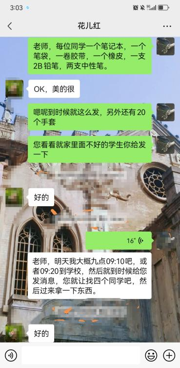 兰元元与老师关于捐赠学习用品的聊天记录。