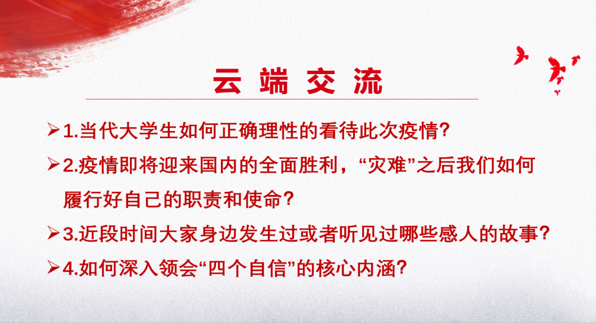 云端交流板块中,全体同学围绕“当代大学生如何正确理性的看待此次疫情”和“疫情之后我们如何履行好自己的职责和使命”,“近段时间身边的感人故事”以及“如何深入领会‘四个自信’的核心内涵”四个问题进行了热烈讨论。广大同学积极发言,讲体会,表决心,进一步增强了广大同学的责任感和使命感,激励担当作为,坚定战胜疫情的信心。
