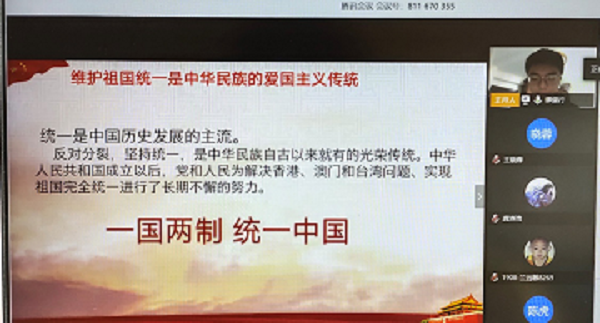 计算机1908班主题班会重点围绕“祖国统一和领土完整”、“网络安全”两个方面展开。首先,团支书廖健行分析了当前的台海形势,带领大家学习《反分裂国家法》,观看习近平总书记在《告台湾同胞书》发表40周纪念会上的讲话,坚定同学们对于实现祖国统一的信念。在“网络安全”方面,全班同学学习“民大资助与你同行”微信公众号发布的防诈骗推文,通过理论学习和互动答题的方式,提升同学们的防诈骗意识。