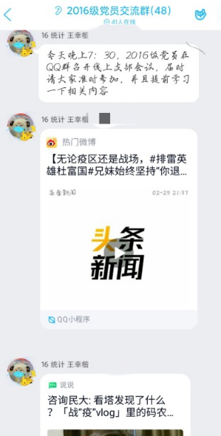一场席卷全国的疫情牵动着全国人民的心,更是牵动着中共中央总书记习近平的心。总书记主持召开政治局常务委员会会议,发表重要讲话,作出重要指示,以及给在钢首医院实习的西藏大学医学院学生的回信,表明了他时刻牵挂人民群众的生命安全和身体健康的心情。为认真贯彻学习习近平总书记关于做好疫情防控工作的系列讲话精神以及回信精神,充分发挥基层党组织战斗堡垒作用,发挥党员先锋模范作用,以及解答2016级毕业生就业升学问题,近日,数学与统计学学院本科生党支部书记、2016级辅导员陈博组织支部42名党员召开了线上支部会议。 线上支部会议开始之前,主持人王幸楷带领2016级各位党员们提前观看学习了习近平总书记给西藏大学医学院学生的回信和一些疫情期间党员模范先进事迹,希望大家能牢记总书记的殷殷嘱托,从先锋模范身上看到他们的闪光点,严格履行党员义务,坚定信心,感恩奋进,为新时代事业发展和改革发展稳定各项事业贡献力量。