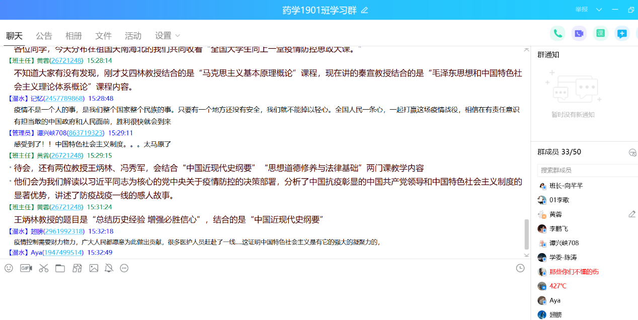 班主任老师引导同学们对“一堂课”的课程内容积极讨论。 在思政大课授课过程中,艾四林、秦宣、王炳林、冯秀军四位教授立足马克思主义基本原理和中国特色社会主义理论体系,深入解读以习近平同志为核心的党中央关于疫情防控的决策部署,雄辩地证明了中国共产党作为中国特色社会主义领导核心的显著优势,分析了中国特色社会主义的制度优势。围绕这堂思政大课,药学院师生通过QQ群、微信群等开展了深入充分的讨论发言。 江莹(药学院党委书记,汉族):实现中华民族伟大复兴的中国梦需要勇担使命,开展具有新的历史特点的伟大斗争。从中央到地方、从政府到民间组织,无不全力以赴投入到这场战斗中。在这场战斗中,党中央总揽全局、协调各方,始终坚持以人民为中心,充分彰显了中国特色社会主义的制度优势,体现了中国共产党是中国特色社会主义的领导核心地位。药学院全体师生要坚定信心,始终与党中央保持高度一致,要集中优势力量开展科研攻关,要通过网络渠道积极开展线上教学,确保停课不停教、停课不停学,要号召带动更多师生主动自觉投身社区志愿服务,为疫情防控决战决胜贡献力量。 刘吉开(药学院院长,汉族):在这次疫情防控阻击战中,全国各级党组织在党中央的领导下雷厉风行,形成了体系化的防控组织。习近平总书记多次对疫情防控工作作重要指示批示,多次召开中央政治局会议专门研究部署疫情防控,中央政治局带头捐款、中国政府整合协调各方力量支援湖北,国内各省市地区无私捐款捐物,为疫情防控工作贡献力量。白衣战士舍身忘己,战斗在一线。湖北人民特别是武汉人民从大局出发,以血肉之驱阻击病魔,作出巨大牺牲。凡此种种无不表明,这是中国磅礴力量的体现,是中国特色社会主义集中力量办大事的体现,是中国特色社会主义制度优势的体现,是中国共产党总揽全局协调各方的领导核心地位的体现。药学院师生要更加紧密地团结在以习近平同志为核心的党中央周围,坚定不移听党话跟党走,守初心担使命,用一流的教学、一流的科研、一流的社会服务来书写时代答卷。 方明(药学院党委副书记,土家族):我在武汉亲历了新冠肺炎阻击战,这场战疫中涌现出大量感人事迹,这些感人事迹是讲好中华民族在中国共产党领导下经历各种考验实现伟大复兴的“中国故事”,我们要将这些思政教育的生动素材分享给学生。作为大学生思政教育的工作者,我们要立足于中国抗击疫情的具体实践,引导青年学生深化对中国特色社会主义理论的认识,牢固树立“四个意识”,坚定“四个自信”,坚决做到“两个维护”,把爱国当做最大的责任担当,勤奋学习、勇于担当,在实现“中国梦”的征途中谱写最美的青春之歌。 马媛(药学院科研秘书,汉族):通过这节疫情防控思政大课的学习,让我对于这场战“疫”有了更深的认识。在此次抗疫过程中,充分体现了中国共产党领导和中国特色社会主义制度的显著优势。困难不会使我们倒下,而是让我们更加坚强,我们也乐于向世界各国分享中国智慧。科学技术是战胜疫情的关键,我们要千方百计为学院教师科研攻关创造条件、提供资源,促使更多科研工作者在疫情防控中创造一流业绩。 黄蓉(化学生物系主任,汉族):磨难压不垮,奋起正当时。中华民族从来不缺乏面对困难的勇气,党员发挥先锋模范带头作用,彰显了党的集中统一领导的显著优势,坚持党的领导、坚持全民抗战,我们一定能赢得疫情阻击战的最终胜利。在做好新冠肺炎疫情防控工作的关键阶段,我们要肩负时代赋予的重担,在大考中守初心、担使命,以立德树人的担当作为彰显新时代教师的风采。 李丹(药学院团委书记、辅导员,汉族):42000余名医务人员、20000余名工程建设者、50000余名志愿者、亿万资金和物资……这些数字的背后是国家的强大、人民的支持,是中国特色社会主义制度优势的体现,是中国共产党坚强领导的彰显。疫情面前,全国上下,万众一心、众志成城,展现了中华民族的团结和英勇斗志。没有一个冬天不会过去,没有一个春天不会到来,我们一定会取得这场战役的胜利!我们应有担当和责任,在自己的工作岗位上扎实奋进,发光发热,为国家贡献自己的力量。 王艺燊(2017级药物分析专业本科生,汉族):面对疫情“大考”,中国采取坚决有力的防控措施,为世界各国赢得了时间。疫情如令,责任如山。在这场众志成城、同仇敌忾的战斗中,中国人民的团结信念和责任感令世界影响深刻。我对我们国家在疫情中的担当感到骄傲,我坚信在中国共产党的领导和社会主义制度的最大优势下,中国一定能够打赢这场防疫“战”! 王单(2017级药物分析专业本科生,回族):今天这堂课将会是我们人生中一堂比较特殊的课。冯秀军老师谈“中国青年的责任与担当”时说到,“从不存在一个人的桃花源,历史的接续传承就是一代使命和责任的接力”,我在思考接下来的我要做什么、怎么做、如何做实现自我价值、如何为社会做出贡献。扎根中国大地,不负祖国的期望,用努力奋斗的青春,把自己成就为一个有理想、有本领、有担当的时代新人。“国家兴亡,匹夫有责”,“苟利国家生死以之”的爱国精神接续,正是我们中华民族生生不息,亘古绵延的精神密码,我们是中华儿女,中华民族的伟大复兴舍我其谁。疫情无情,人间有爱,我们一起携手同舟共济、