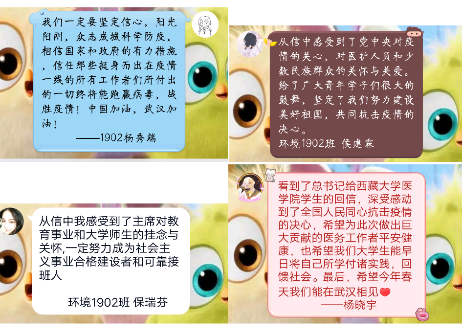 同学们交流学习心得并为武汉加油。 本次班团会紧扣主题,形式多样,既有线上集体学习、自由发言交流,又有以宿舍为单位进行小组讨论分享体会、拍摄武汉加油小视频等。在主题班团会上,同学们纷纷表示向那些投身于疫情一线的医务工作者致以崇高的敬意,虽然无法像医务工作者一样救死扶伤,但会以医务工作者为榜样,时刻牢记习近平总书记对广大青年学生的殷切期待,努力学习专业知识,练就过硬本领,锤炼品德修为,积极投身祖国的生态文明建设,用实际行动肩负起新时代青年的使命和担当。正如1902班的候建霖同学在班团会上的发言:“从习近平总书记的回信中可以感受到党中央对疫情的关心,对医护人员的关怀和关爱,这给了广大青年很大的鼓舞,坚定了我们共同抗击疫情、建设美丽祖国的决心。” 通过本次线上主题班团会,资环学子认真学习并领会了习近平总书记的重要回信精神,让同学们更加坚定了战胜疫情、守护家园的信心,更加坚定了作为当代青年大学生应练就过硬本领、毕业后到祖国和人民最需要的地方去奉献青春、实现人生价值和梦想的决心。 此外,本次主题班团会上学院对在疫情期间参加抗疫志愿服务的我院同学事迹进行了宣传,同时搜集了解同学们遇到的困难情况,并再次强调了返校纪律要求。 (来源:资源与环境学院 编辑:梁潇潇)