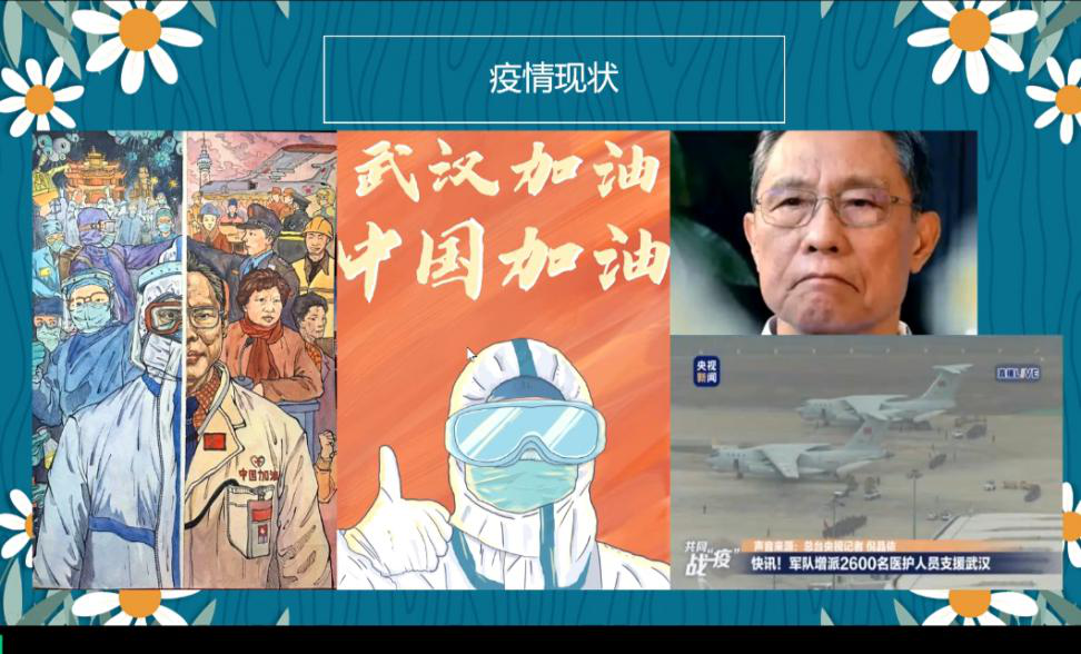 在线班会中用于展示相关内容的图片。 “哪有什么岁月静好,不过有人替你负重前行” 通过重温抗疫期间的温暖人物和感人事迹,各班同学对所有奔赴在抗疫前线的工作人员表示了崇高的敬意和感恩。从钟南山和李兰娟院士到所有医护人员,从部队军人到基层干部等等,还有各行各业的抗疫志愿者与爱心捐赠者,都深深地激发了同学们的感恩与钦佩之心。“我觉得疫情不只是让我们被迫待在家里,其实它也带来许多感动。千千万万医护人员、军人、志愿者都在行动,我们不仅要向他们致敬,更应该珍惜现在的生活”,来自法学1803班的冉茂婷说。 “珍惜学习时光,练就过硬本领” 经历过疫情,让我们更加懂得珍惜正常的生活秩序和学习机会。这是多数同学的最大心声。尤其在学习了《习近平给在首钢医院实习的西藏大学医学院学生的回信》精神之后,同学们纷纷表示:自己作为大学生,也感受到了习总书记对于青年学子的殷切希望,非常怀念适宜学习的校园环境,开学后一定加倍努力,不虚度练就本领的重要时光。 “隔离期间的日常点滴,爱与温暖结伴同行” 不再做饭来张口、衣来伸手的孩子,而是为父母分担一定的家务劳动。不少同学展示了自己在隔离期间练就的厨艺和其他技能,来自西部班实验班的丁磊同学分享的一段爱心灯塔DIY小视频,让大家眼前一亮,心中暖流。