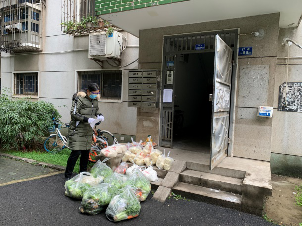 朱晶晶老师为家中缺菜的老师送菜。 当了解到本楼栋一位退休老教师家中即将“弹尽粮绝”时,她便从自己家购买的物资里面分了一些蔬菜、米、鸡蛋和水果送给了老人。为了更好的沟通联络,同时相应国家号召无接触式服务,她建立了17栋微信群。截止目前,17栋所有居民全部进群,大家互通信息。为了给大家的“宅”家生活提供便利,她都会第一时间把学校和社区的通知公告、各类团购信息、生活服务信息转发至群中,便于居民了解和掌握相关信息。对于大家提出的各类困难,竭尽所能,助力解决,实在解决不了的就主动上报学校寻求帮助。值得欣慰的是,在大家共同努力下,17栋秩序良好,大家友爱互助,大家纷纷表达有组织的人的幸福感。