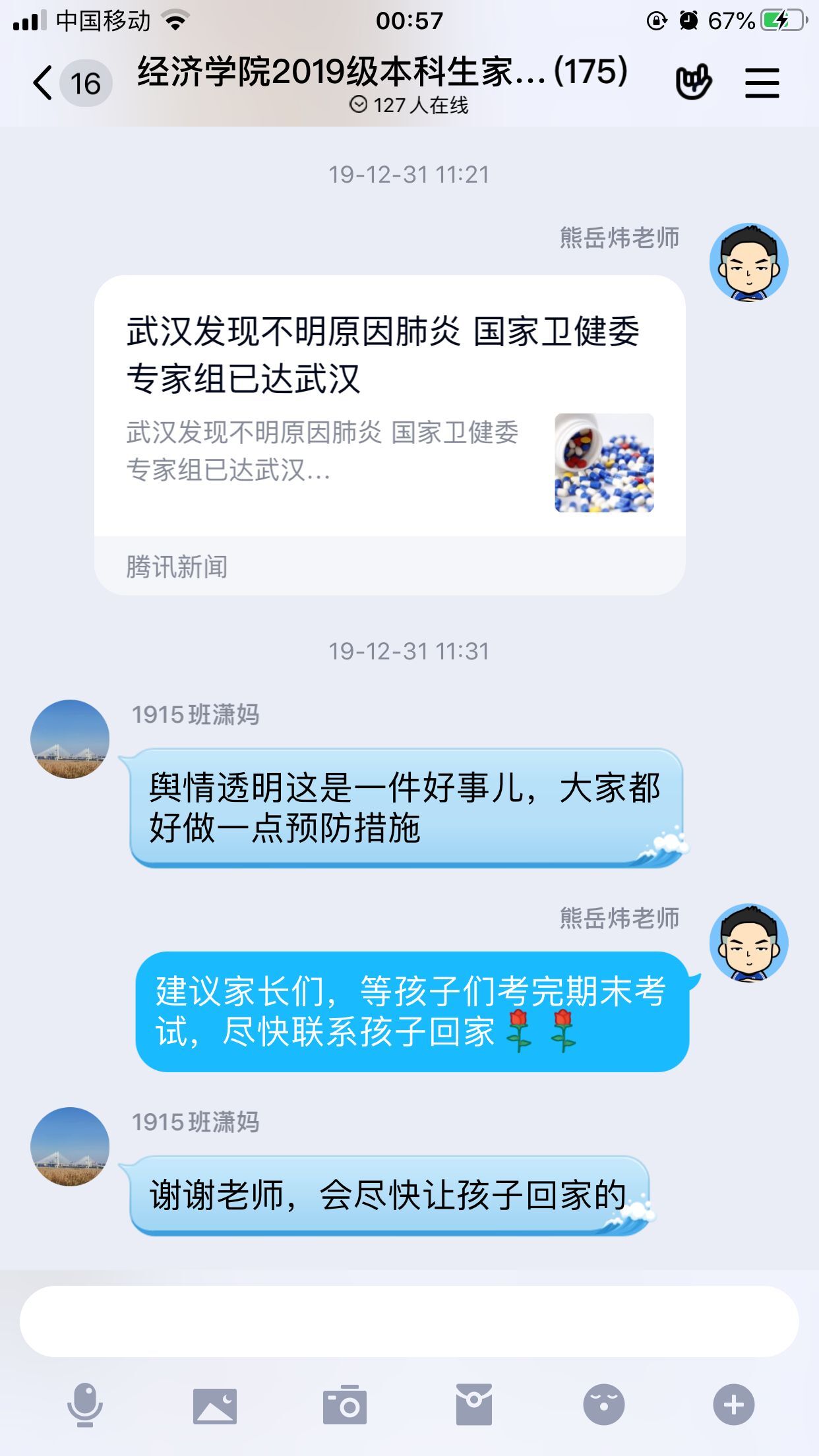 熊岳炜老师在日常工作中注重加强与家长的联系和沟通。 熊岳炜:每个“微不足道”的勇气,都是共同战疫的勋章;每份“微不足道”的努力,都是春暖花开的风信。战疫犹酣,还容不得半点松劲;拐点将至,更不能鸣金收兵。人类命运共同体的求生之路其实从未停止;而立德树人的我们,除了用爱心滋养学生,更要与时俱进,更新知识、鼓足勇气,才能保护学生。无情的病毒只会让我们更勇敢、更博学、更仁爱,待疫云散去,我们的校园、城市一定会更美好! (审核:李川国 编辑:梁潇潇) invisible invisible invisible