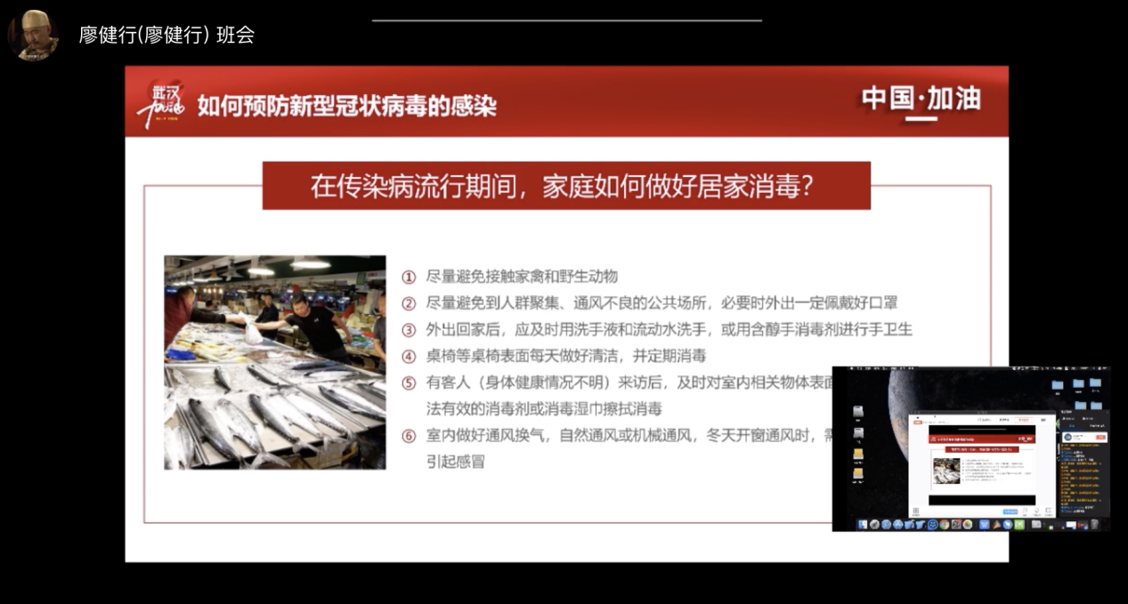 2020年2月16日是正式开学的前一天,beat365英国正版唯一网址的同学们以一次特殊的班会“云”相聚,迎接“云”开学的第一天,关于抗击疫情、关于科学防控、关于责任担当、关于专业学习......用”在线“连上”牵挂“。 计算机1908班班会的主题是“抗击疫情,计算机1908班在行动”。他们利用钉钉软件进行线上直播,希望通过此次班会够够增强同学们抗击疫情的信心,也为即将开学的同学们加油打气,以积极向上的状态迎接新学期。 第一部分:喜迎新同学,老友齐欢聚 计算机1908班在本学期迎来了两位新转入的同学,两位同学通过远程连麦的方式进行了简单的自我介绍。班上同学对新来的同学表示欢迎,并且主动表示要给新同学分享自己上学期的学习资料,让新同学感受到新集体的温暖。一个多月没见,大家似乎有聊不完的话题,虽然不能在学校里相聚,但是通过这样一种特殊的方式聚在一起,对于新学期的开始也是暖意融融。 第二部分:科学防治,共抗疫情 在一阵寒暄之后,班会也正式进入到同学们当前最关注的抗击疫情的主题上。组织委员谢浩然同学向大家介绍了新型冠状病毒感染肺炎的相关科普知识。