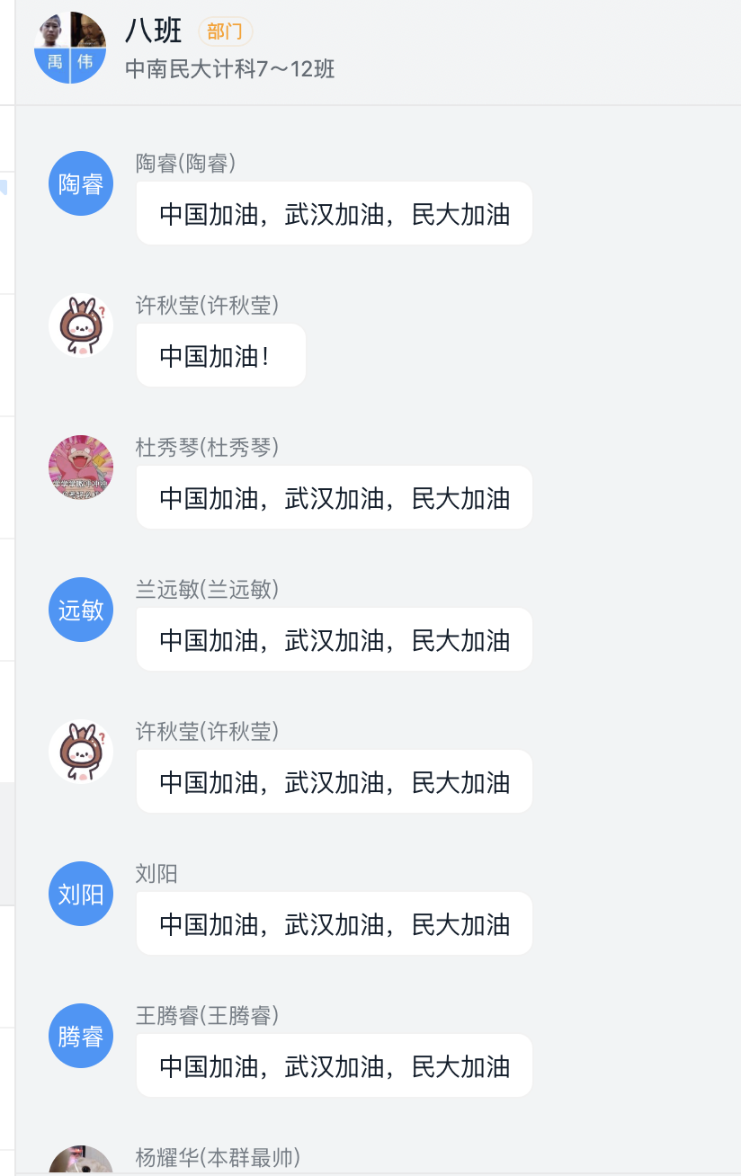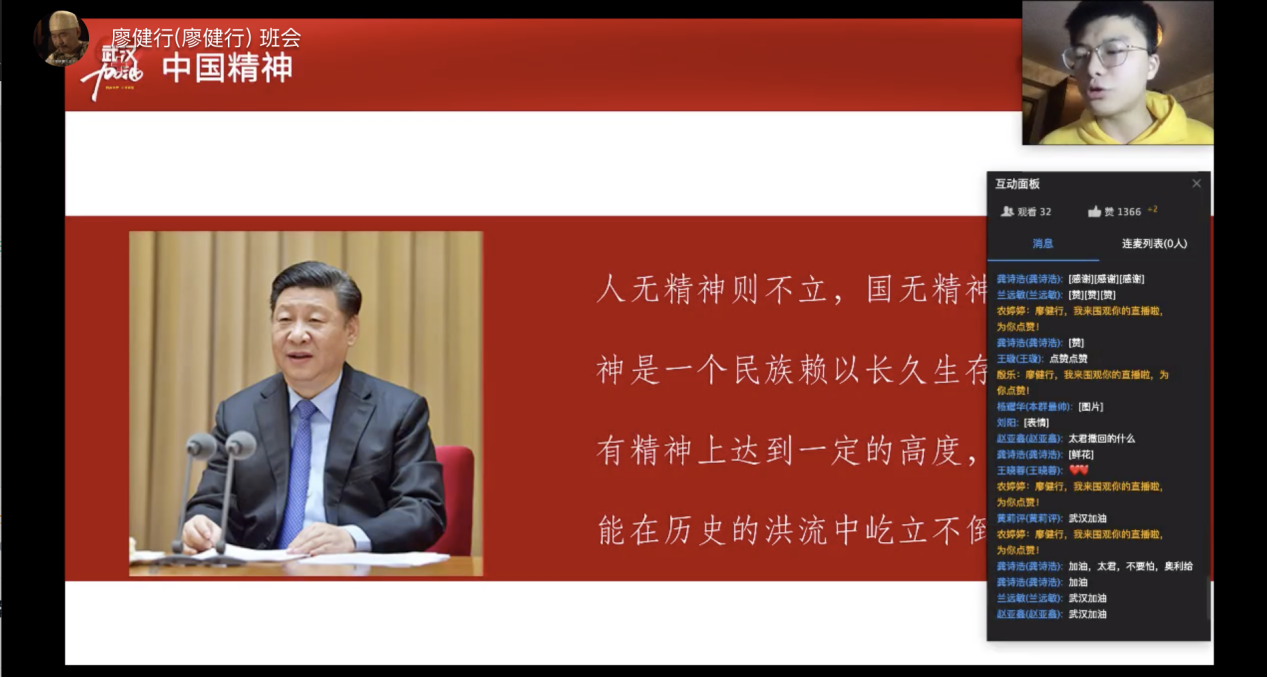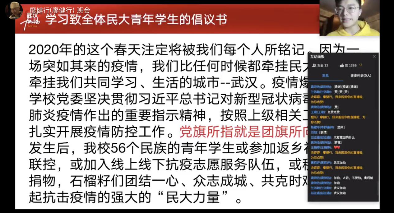 接着以实际例子讲述了中国精神在98年抗击大洪水,03年抗击非典,08年抗争救灾发挥的巨大作用。这些精神成为鼓舞人心、凝聚力量、团结互助、战胜灾难的强大精神力量。在这场疫情面前,我们同样也会用强大的中国精神力量战而胜之。 最后,团支书自豪而激动地说:“我们坚信,有党的坚强领导,有集中力量办大事的特有优势,有综合国力的强力支撑,有中国精神的巨大激励,抗击疫情阻击战必将取得决定性的胜利。‘借问瘟君欲何往,纸船明烛照天烧’,中国人民必将再次谱写一曲自强不息的胜利赞歌。” 第四部分:祈福民大,祈福武汉,祈福中国 团支书廖健行带领全班同学学习校团委发起的《致全体民大青年学生的倡议书》。同学们积极响应号召,在讨论区上纷纷发起了“中国加油,武汉加油,民大加油”的接力,为我们伟大的祖国、英雄的武汉、热爱的民大送上最美的祝福。