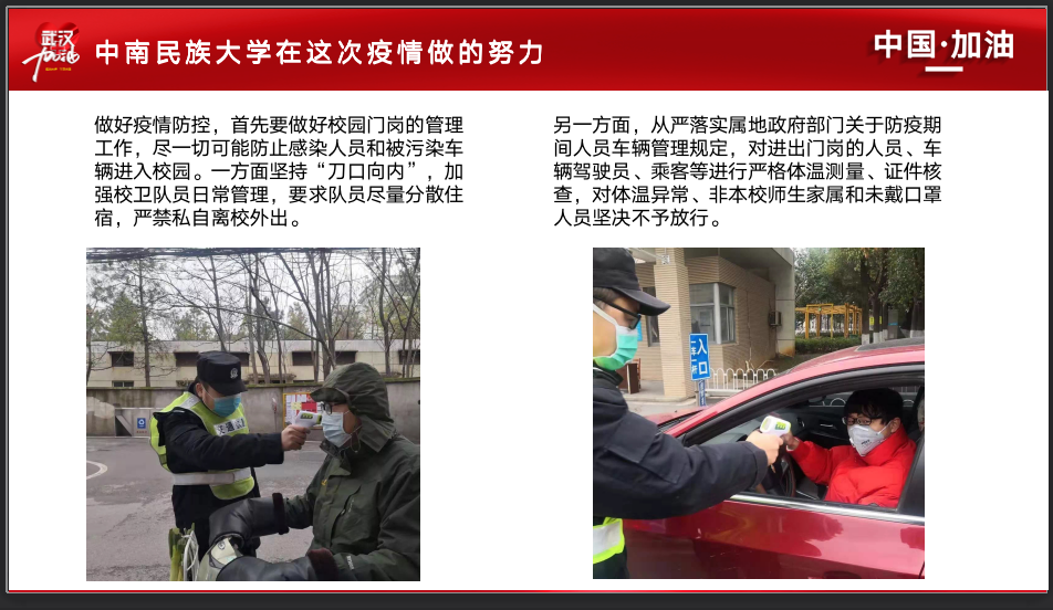 最后,谢浩然同学讲述了学校在此次抗击疫情战役中如何守护我们的校园、如何守护每一位留校师生。面对严峻的形势,学校防疫指挥部积极响应,全面做好消毒工作、体温测量工作,与校医院统一战线,共同做好防疫工作。流传在校医院党员微信群的一段话更是让同学们深受感动,“03年非典我在,09年流感我在,今年我更不会缺席”。面对这些可爱的人,面对这一幕幕熟悉的场景,同学们自发为民大祈福,也为这群民守护者。