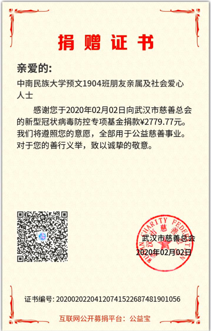 新年伊始,武汉被突如其来的新冠病毒围困。1月25日,预科教育学院文科1904班在班助王思宇(民族学与社会学学院社会学类1903班学生)和班长张秋朗的倡议下,成立了“援汉小分队”,为武汉抗击新冠疫情募捐资金。