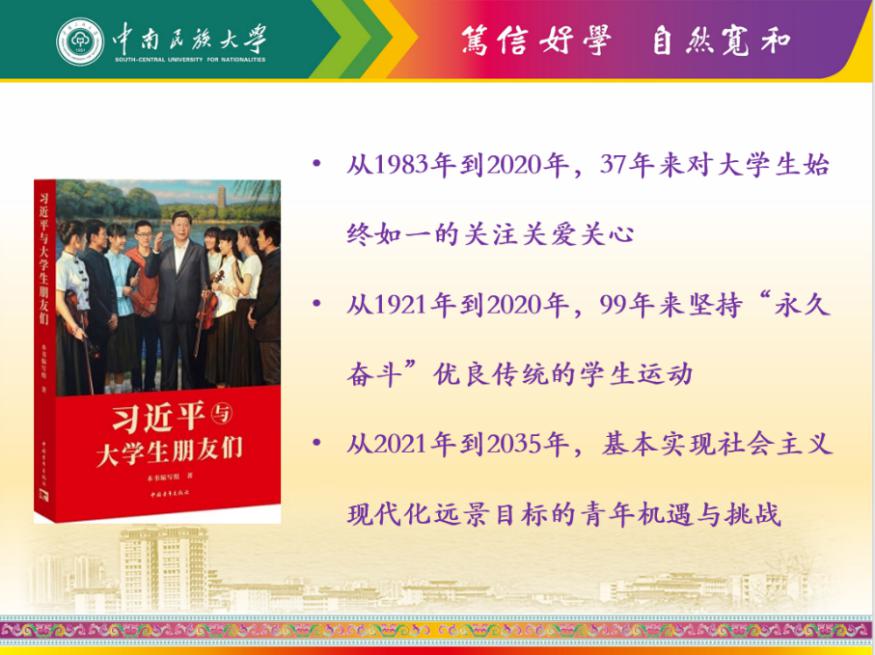 图为安树庭分享主题 杨光旭 摄 安树庭结合书中的案例,和2020年习近平总书记对北京大学援鄂医疗队“90后”党员的回信,带领大家回顾了从1983年到2020年,习近平同志37年来对大学生始终如一的关注关爱关心,引导大家认识到以习近平同志为核心的党中央对青年学生的敦敦教诲和殷切希望。