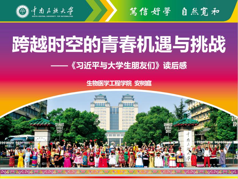 图为安树庭宣讲内容展示 杨光旭 摄 安树庭围绕习近平总书记在纪念五四运动100周年大会上的讲话精神,强调当代大学生要持续发扬“永久奋斗”的精神,坚持弘扬以爱国主义为核心的民族精神和以改革创新为核心的时代精神,强调我们一定要坚持爱国和爱党爱社会主义高度统一。 安树庭强调,党的十九届五中全会提出了到2035年基础实现社会主义现代化的远景目标。当代大学生面临着祖国进一步繁荣富强、个人发展前景更加开阔的机遇,同时也面临着外部势力对我国复兴之路越来越具有实际威胁力的挑战,希望全体同学们能提高政治意识,强化专业技能,勇于创新实践,不断把握机遇,应对挑战,在实现中华民族伟大复兴的道路上不负党和国家的期望,书写属于我们这一代人的青春华章。