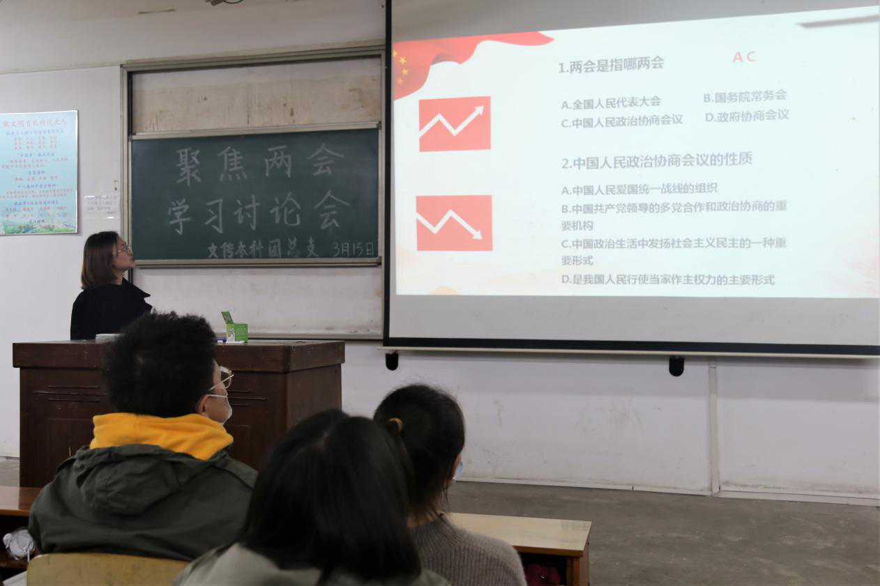 3月15日中午12:30,文学与新闻传播学院在文一楼201教室开展了聚焦“两会”主题团会,团总支组织部王婧同学担任主持人,团总支全体成员参与本次团会。