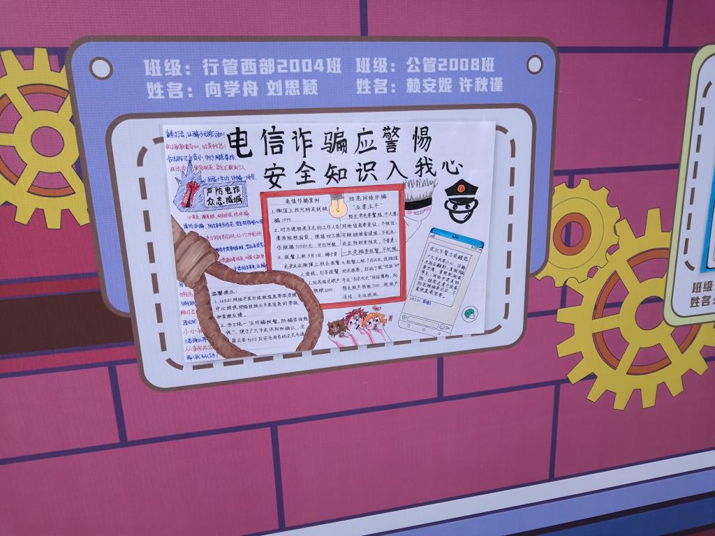 为了深入开展预防电信诈骗宣传教育活动,切实维护学生合法权益,公共管理学院举行了预防电信诈骗手抄报比赛,同学们积极参与,最终有30多个作品脱颖而出。同学们的作品都别具特色,充分体现着广大同学的个性和智慧,评审工作结束以后,所有作品都集中进行展示,目前在15号教学楼下,吸引了许多师生驻足观看,同学们纷纷表示这种形式很吸引人,同时也很有创意,加深了自己对预防电信诈骗活动的理解。