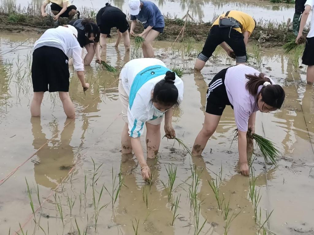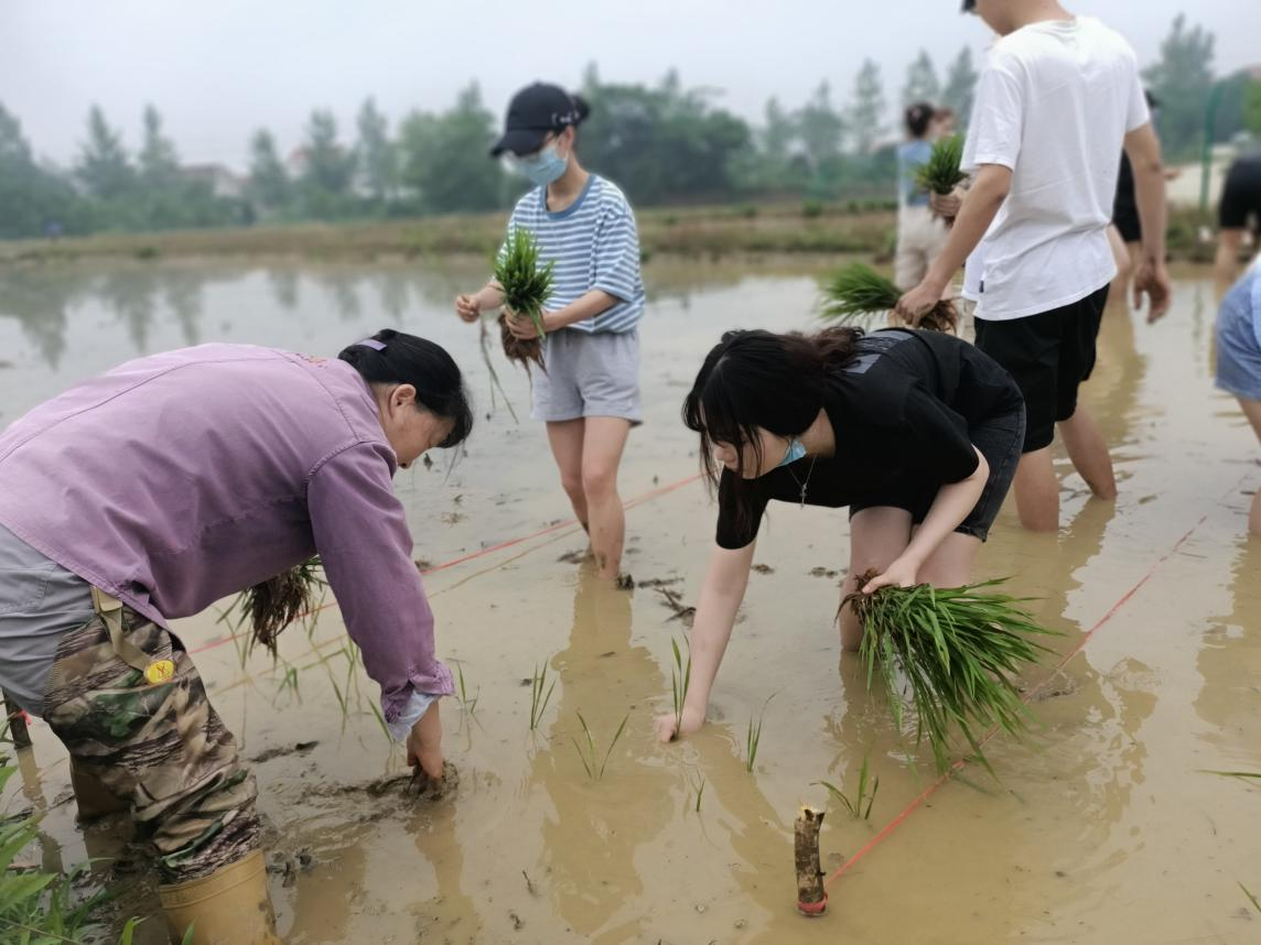 到达目的地后,老师和实践基地的工作人员为同学们示范正确的插秧方法,同学们纷纷挽起裤脚,深入田间地坎开始劳作。