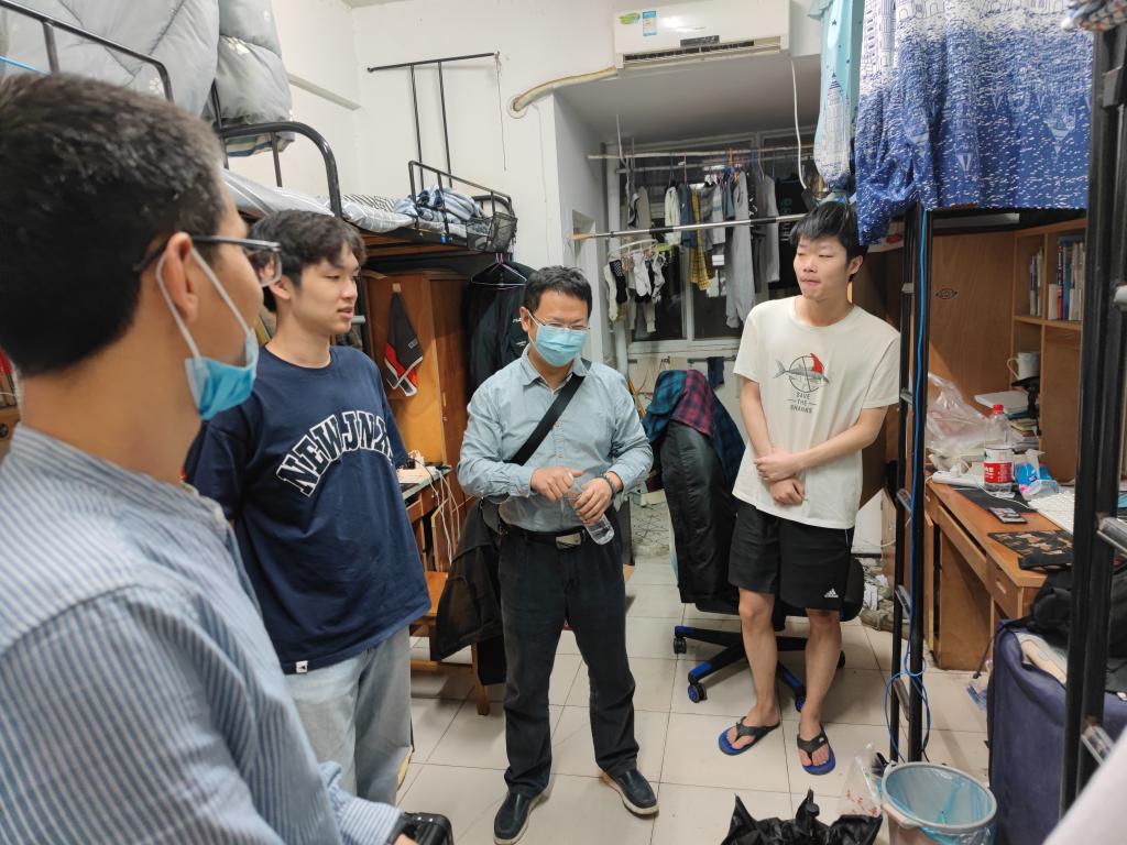 院长孙杰(左三)、副书记黄本金(左一)在宿舍与毕业生交流。 资源与环境科学学院 供图