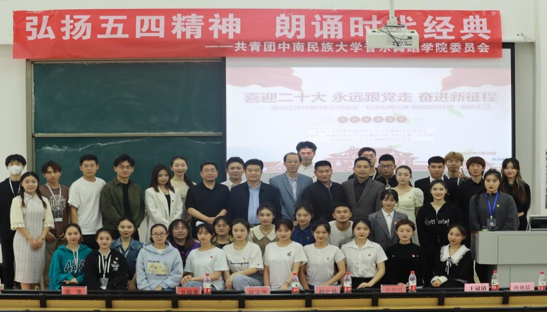 5月23日,为庆祝共青团成立一百周年,喜迎党的二十大胜利召开,音乐舞蹈学院在14-208教室举办题为“弘扬五四精神,朗诵时代经典”的诗歌朗诵大赛。音乐舞蹈学院党委书记徐宝华、专职组织员韦道委、副书记赵小林参加了本次活动。