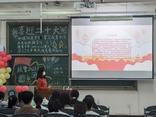 凉秋暮晚,周盈始盛。管理学院各团支部于2022年9月19日至23日陆续召开“喜迎二十大”主题团会。主题团会围绕“喜迎二十大,学习习近平总书记考察武汉时的重要讲话,学习疫情防控知识、校纪校规,宣传防范电信诈骗知识”的内容开展。