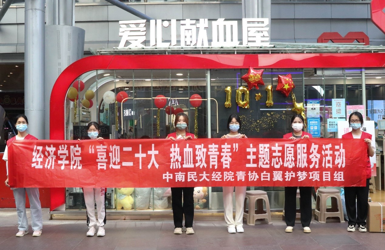为庆祝中华人民共和国成立73周年,迎接党的二十大胜利召开,培养学生社会责任意识和担当精神,10月1日至3日,经济学院青年志愿者协会白翼护梦项目组于光谷世界城献血屋开展了“喜迎二十大,热血致青春”主题志愿服务活动。