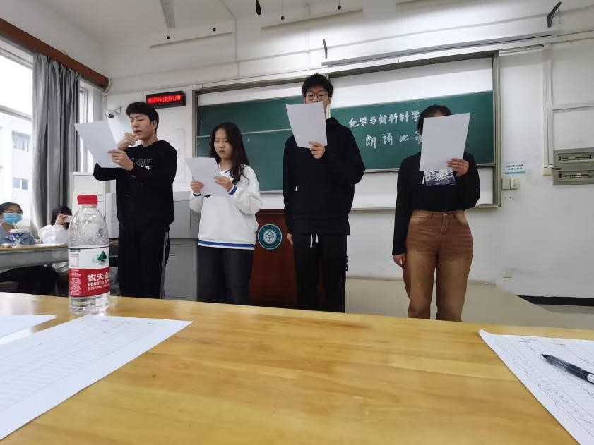 为庆祝党的二十大胜利召开,20221112日,化学与材料科学学院举行了“百年奋斗新征程,时代青年砥砺行”朗诵比赛。