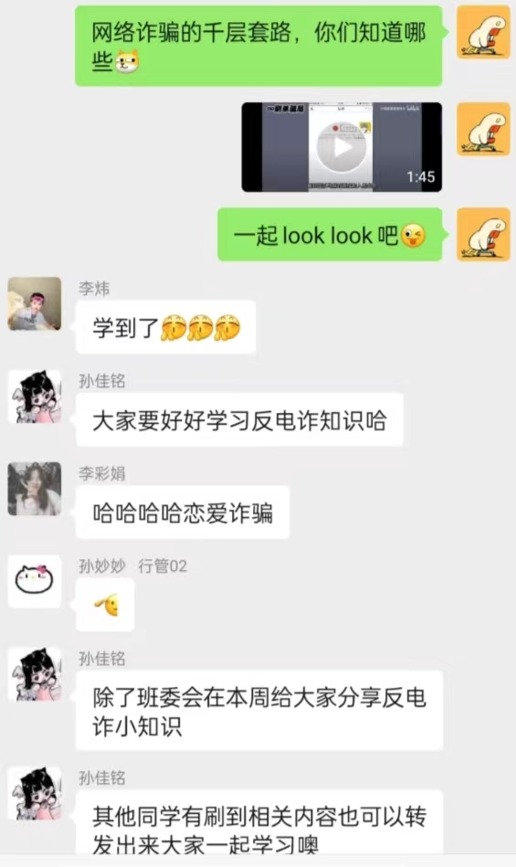 各级各班积极响应,深入宣传防诈骗,宣传形式具体包括开展主题班会介绍诈骗形式及防诈骗的技巧、在班群内提醒同学们防诈骗、发布防诈骗视频、下载国家反诈中心APP……形式多样,效果显著。