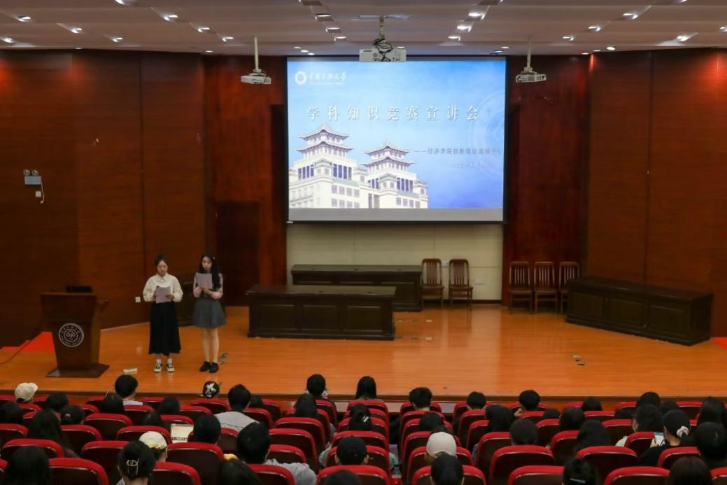 为营造良好的赛事活动氛围,提高同学们的综合实践能力和创新意识,4月9日晚,经济学院在模拟法庭举办了学科知识竞赛宣讲会。经济学院学生工作办公室主任安树庭出席此次会议,2019级优秀学生代表杨玮丽、文砚江、马子祺进行竞赛宣讲,2020级至2022及学生代表现场参加。会议由2022级彭文香、张婧同学主持。