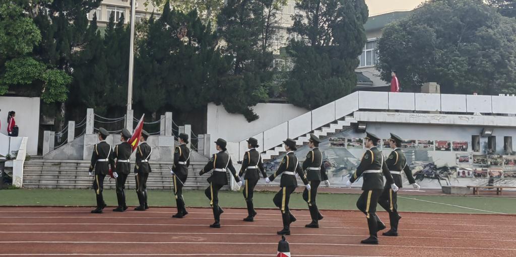 国旗护卫队步伐整齐、英姿飒爽,护送着鲜艳的五星红旗入场。