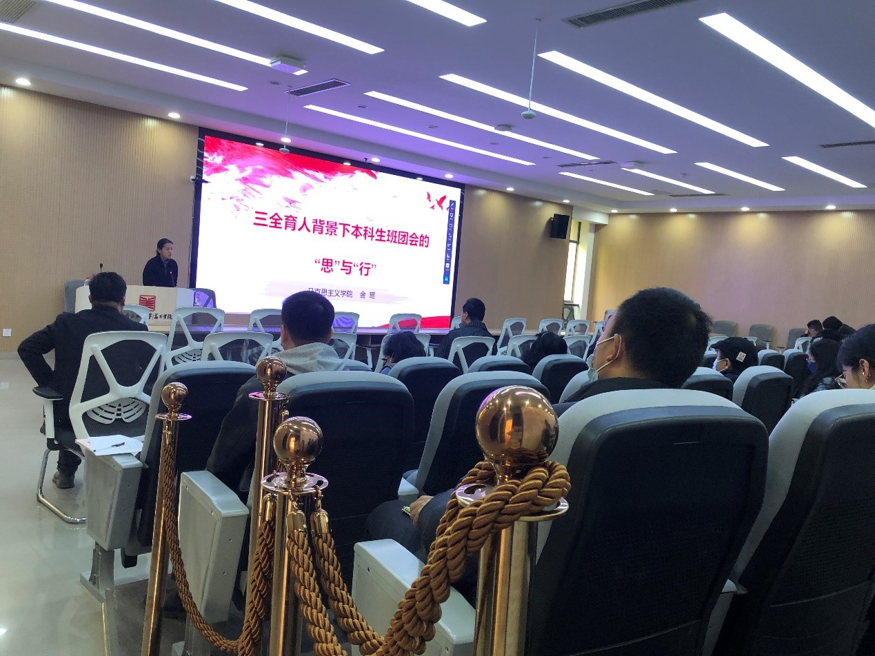 会上,金瑶老师基于自身的思想政治教育学习背景和工作实践经验,从高校思政工作在“三全育人”体系中的重要性切入,详细阐释了班导师开展班团会的不可或缺性;逐一分析了组织开展高质量主题班团会的要素,包括三个聚焦即主题、问题、学生,四个提升即设计感、仪式感、参与感、获得感;五个必备即选题鲜明、素材丰富、讲解透彻、互动充分、反思到位。金瑶老师围绕“全国两会”和“国家安全教育日”为案例主题,详细介绍了主题班团会的素材搜集、组织设计、过程管理和效果转化四个方面的重点内容。